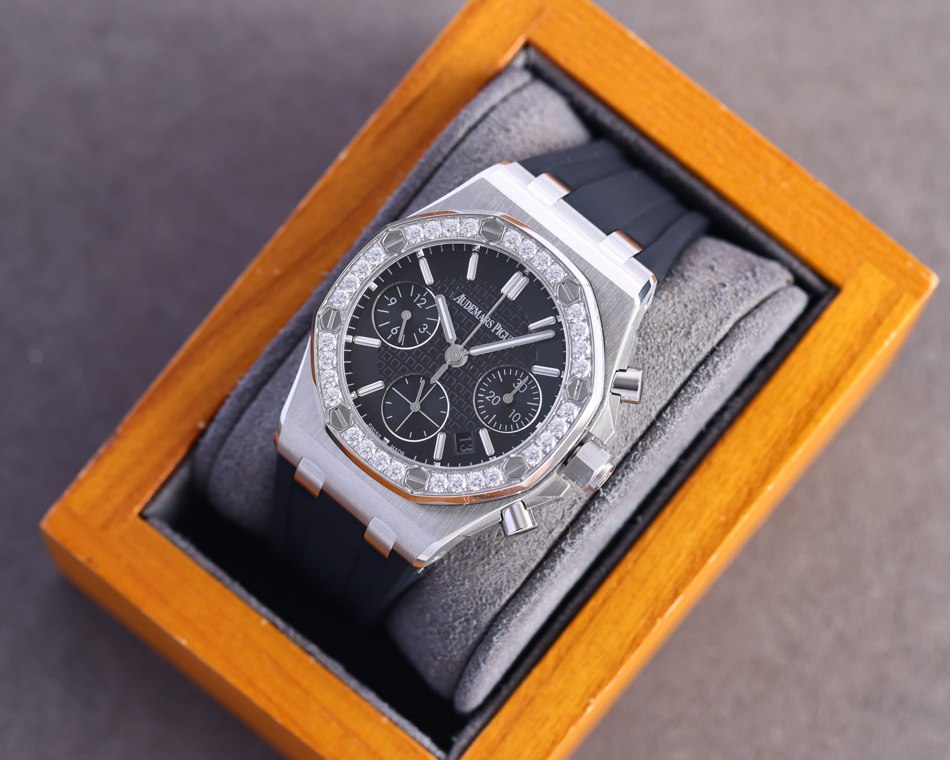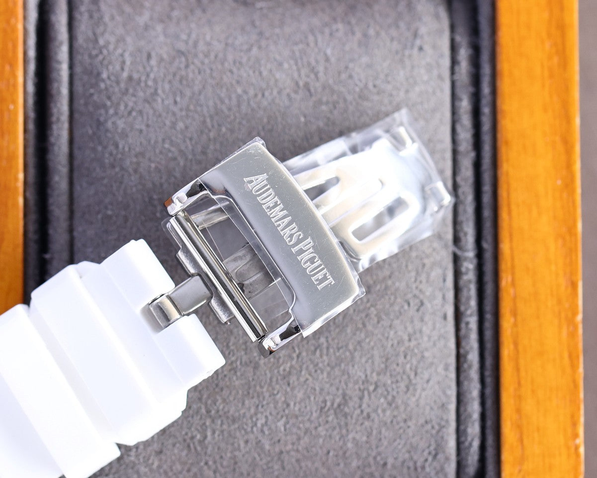 The Audemars Piguet Royal Oak 37mm Ladies Chronograph (1:1 mirror copy) is a luxury multifunctional mechanical watch designed for elegance and precision. It features an imported diamond-set bezel, hexagonal steel crown with brushed finish, and a modified 7750 movement with small seconds at 6 o’clock, fully mirroring the original functions. Sapphire crystal, imported 316 stainless steel case, and molded rubber strap with original folding clasp ensure comfort and style, while the signature octagonal bezel showcases AP’s iconic design.