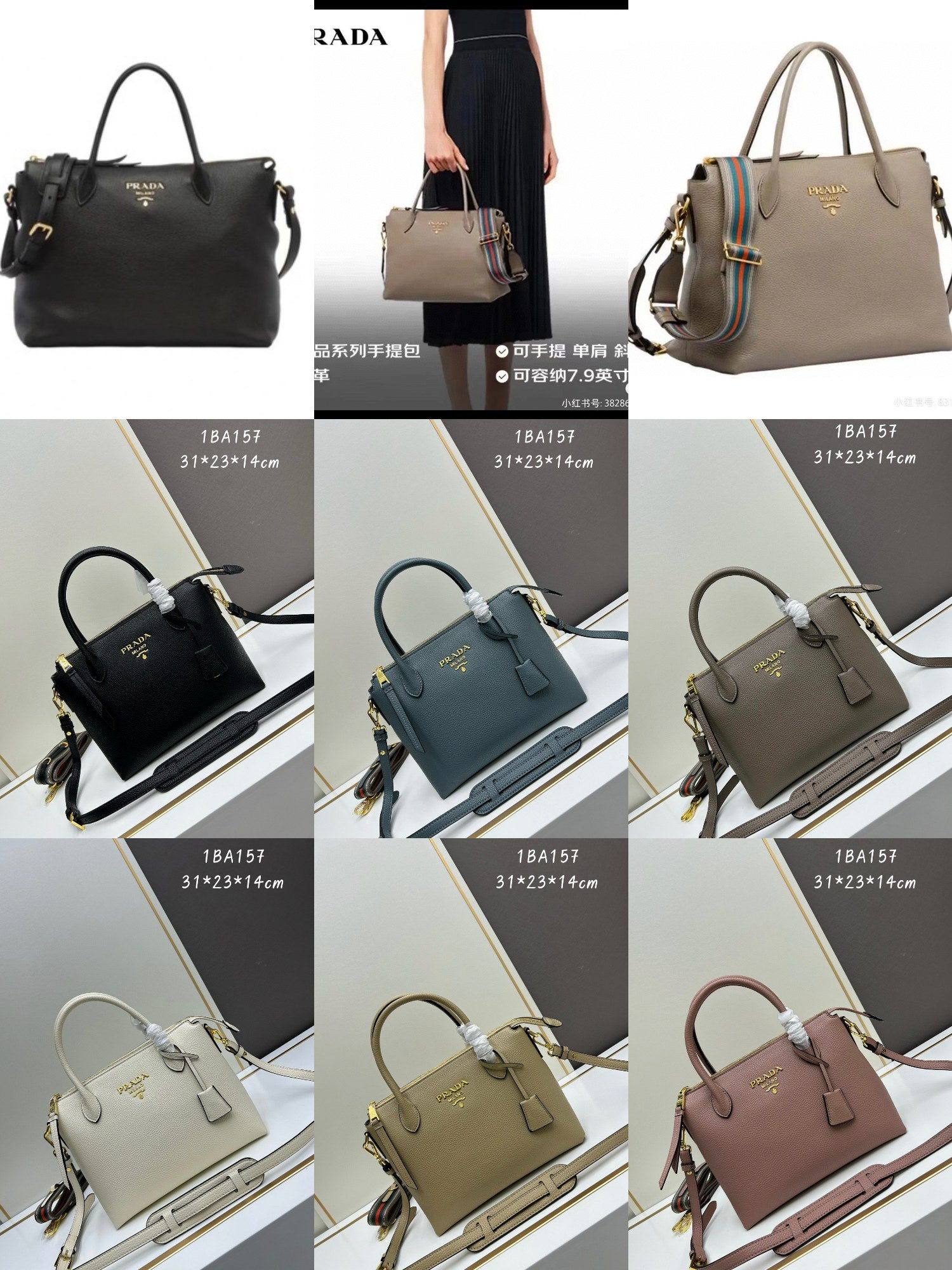Features: Dual handles, detachable & adjustable leather and fabric straps, zip closure, two inner pockets, jacquard PRADA logo lining