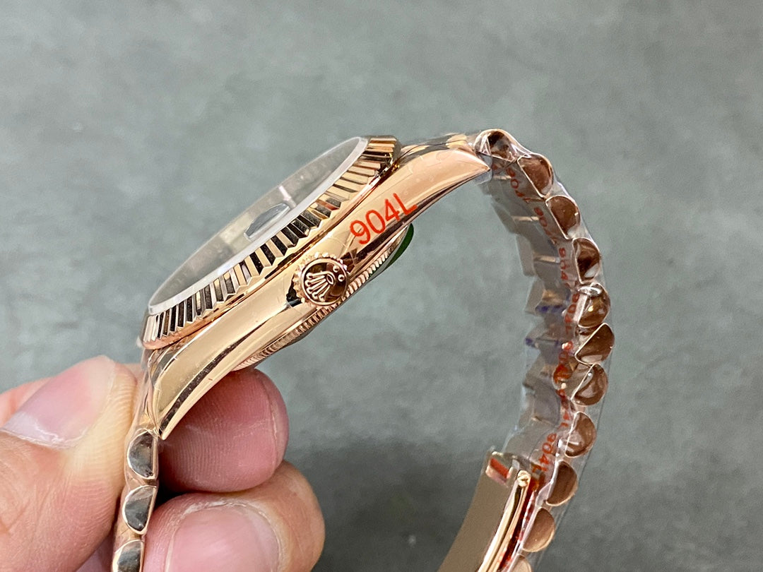 The Rolex Day-Date 40mm with Olive Green Dial exudes sophistication and modern prestige. This 1:1 mirror copy features a 40mm Everose gold-plated case with a fluted bezel and a rich olive green sunburst dial accented by Roman numeral hour markers. Powered by the precise 3255 automatic Swiss movement, it ensures exceptional accuracy and performance. Paired with the elegant President bracelet, this timepiece perfectly balances luxury, craftsmanship, and timeless appeal.
